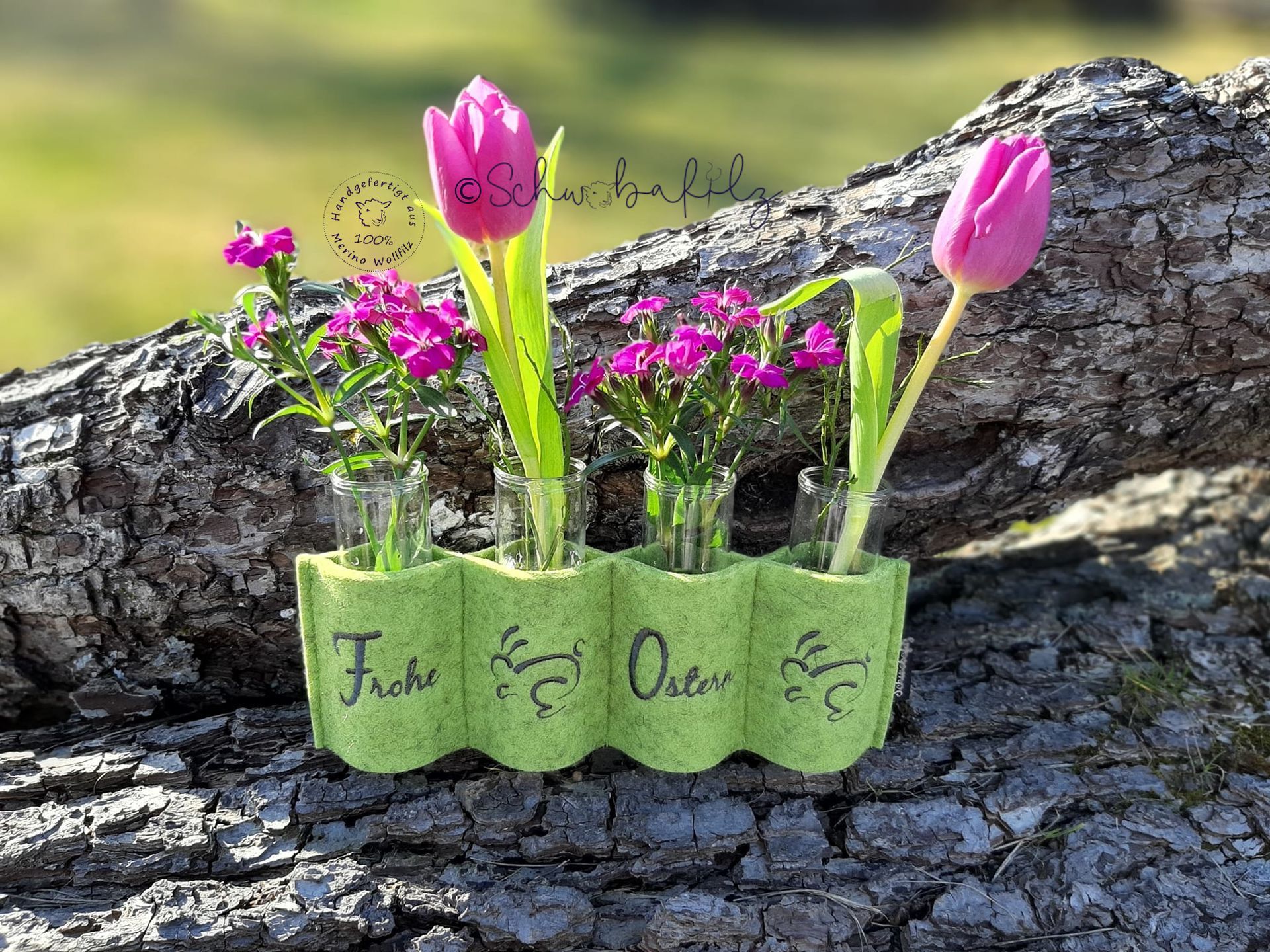 Verleihe Sie Ihrem Zuhause einen Hauch von Frühling und Eleganz mit diesen handgefertigten Vasenhüllen aus hochwertigem Wollfilz. Jedes Vaseset ist einzigartig und sorgt für eine warme und gemütliche Atmosphäre in jedem Raum. Dekorieren Sie Ihre Festtafel, Fensterbank oder Kommode mit diesen charmanten Accessoires und genießen Sie die fröhliche Stimmung, die sie verbreiten.